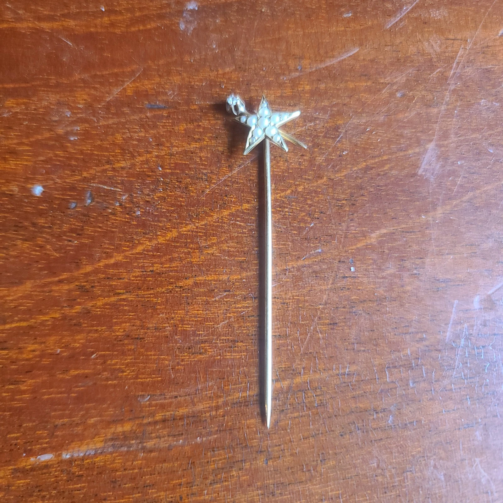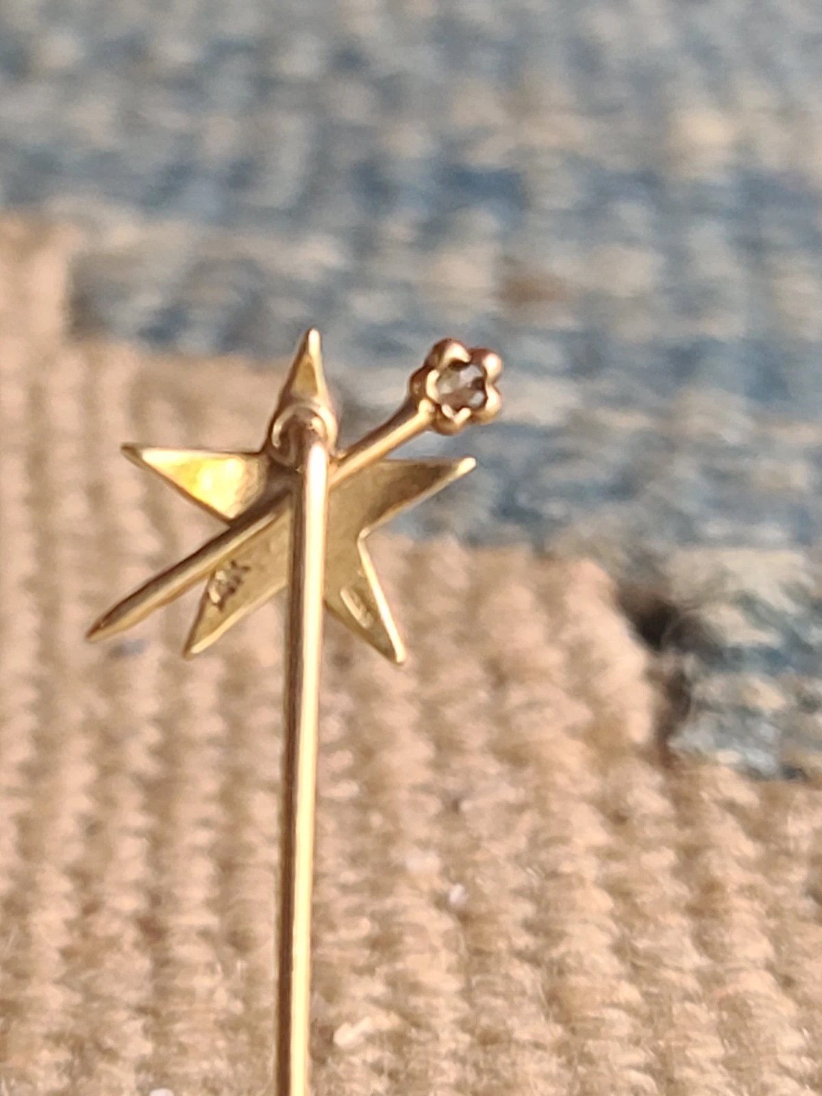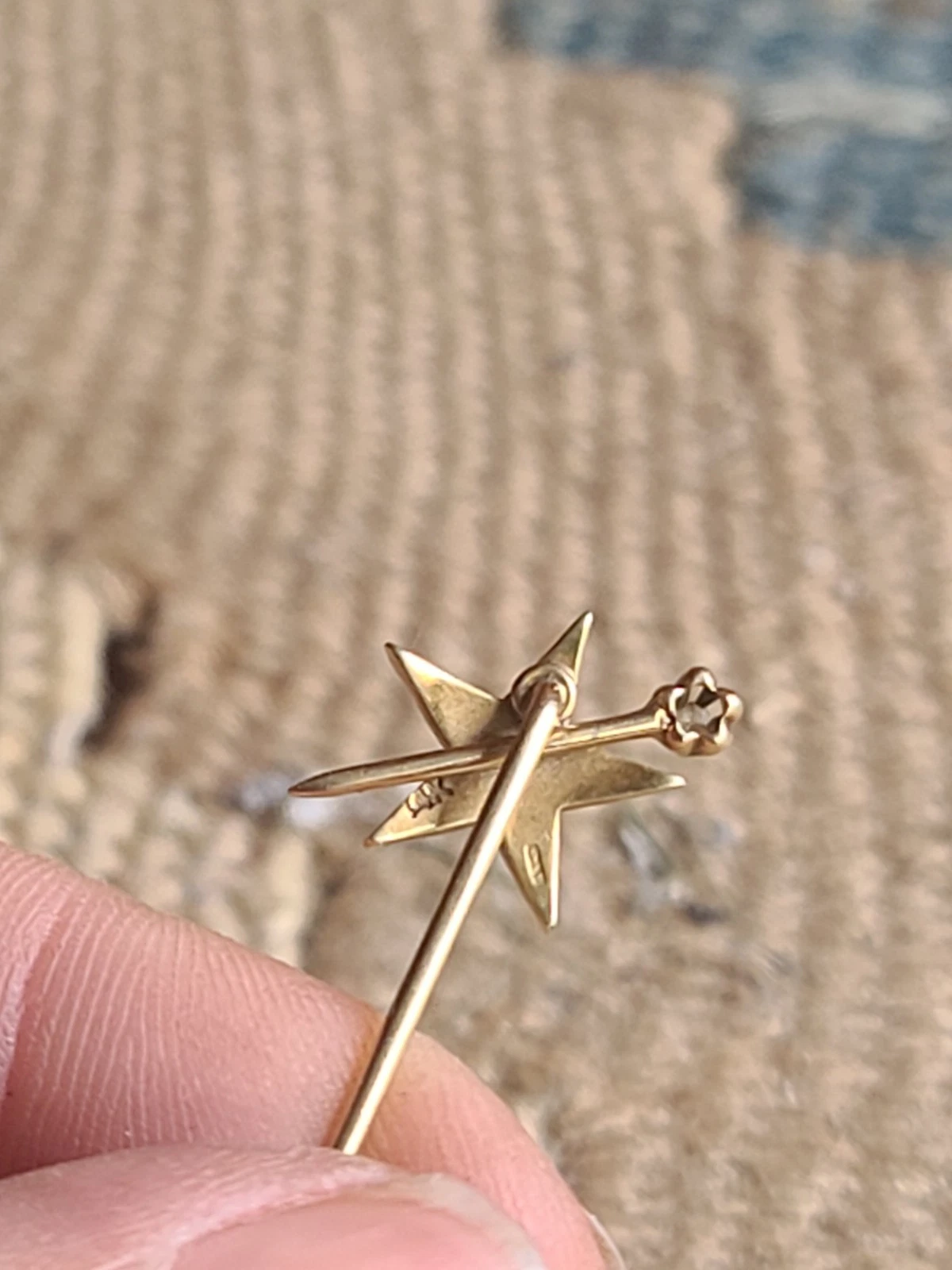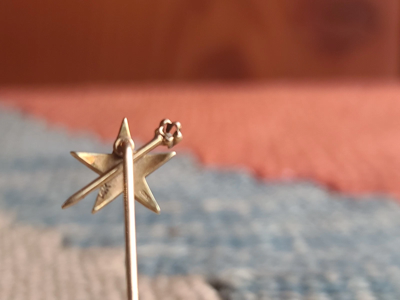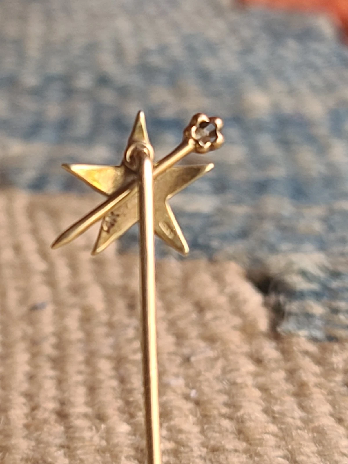 Up for auction is a stunning example of late 19th-century Victorian jewelry. This stick pin is crafted in solid 14K yellow gold and features a radiant six-pointed starburst design.