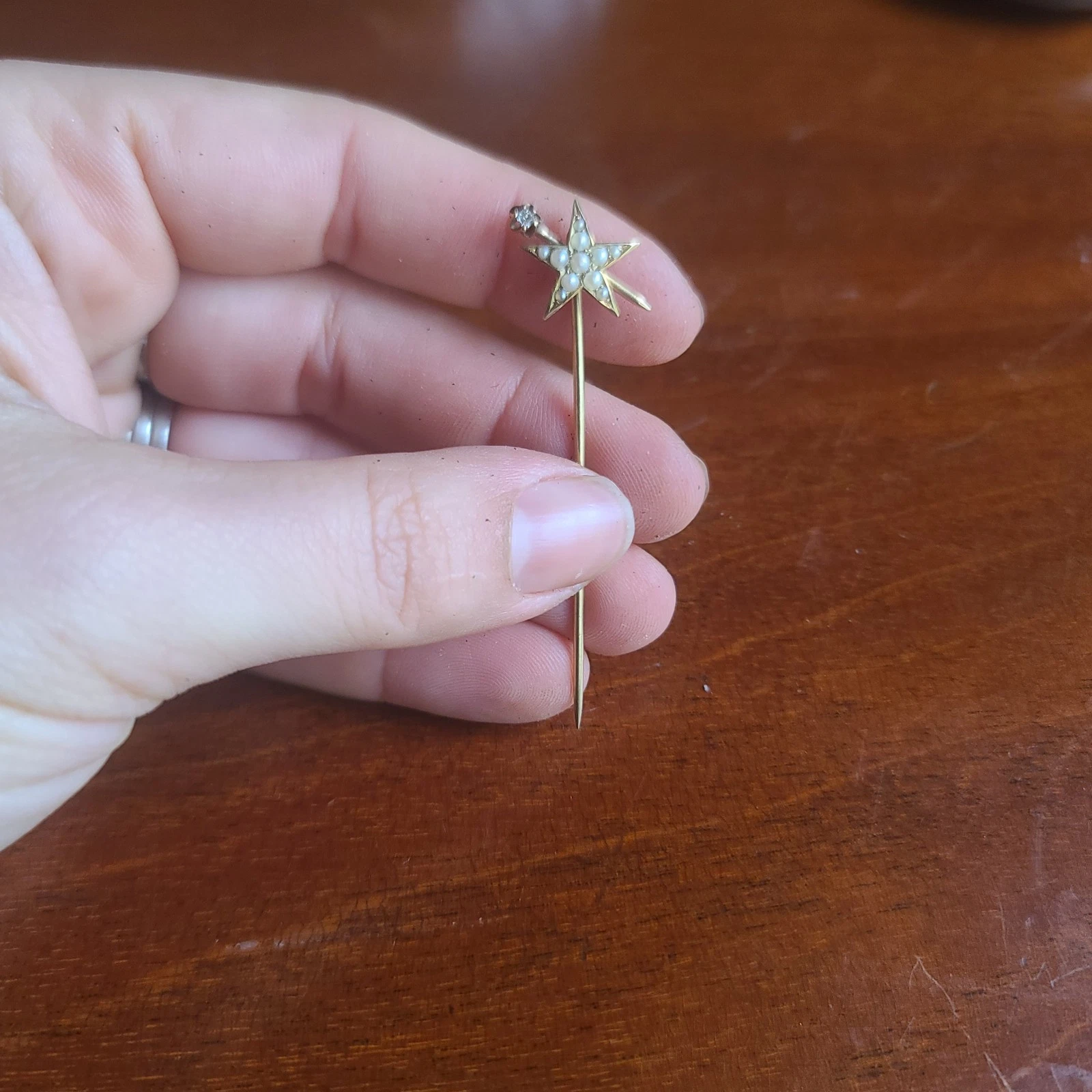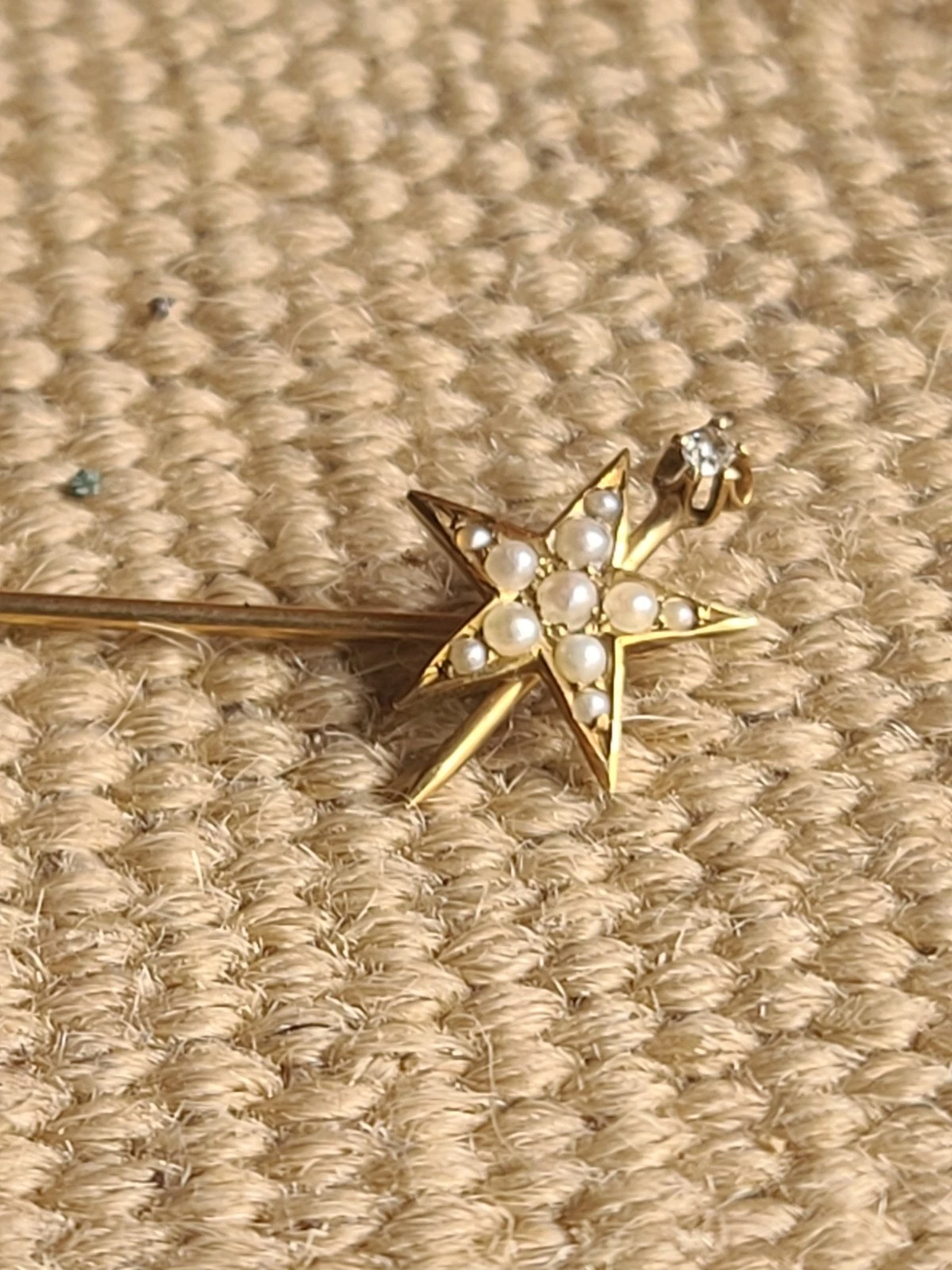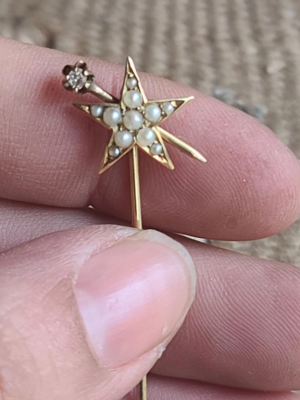 Design: The star is meticulously set with creamy white seed pearls that retain a lovely natural luster. A trailing “tail” features a genuine diamond hand-set in a classic Victorian buttercup setting, giving it the appearance of a shooting star.