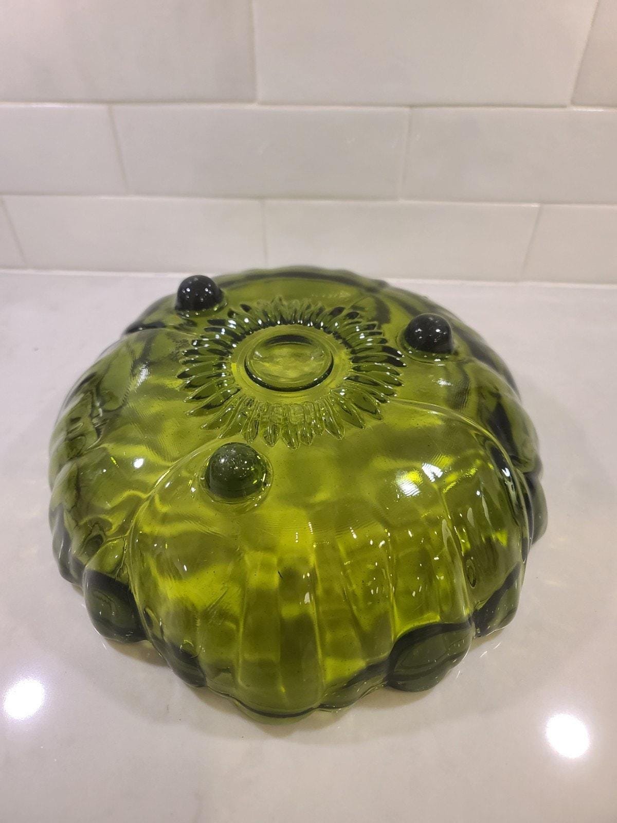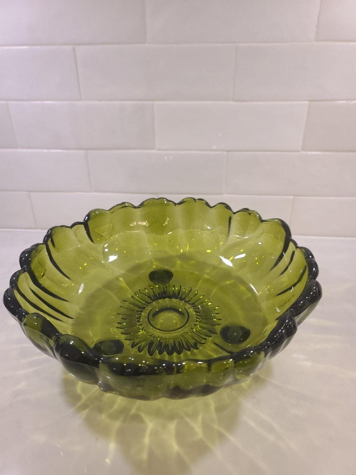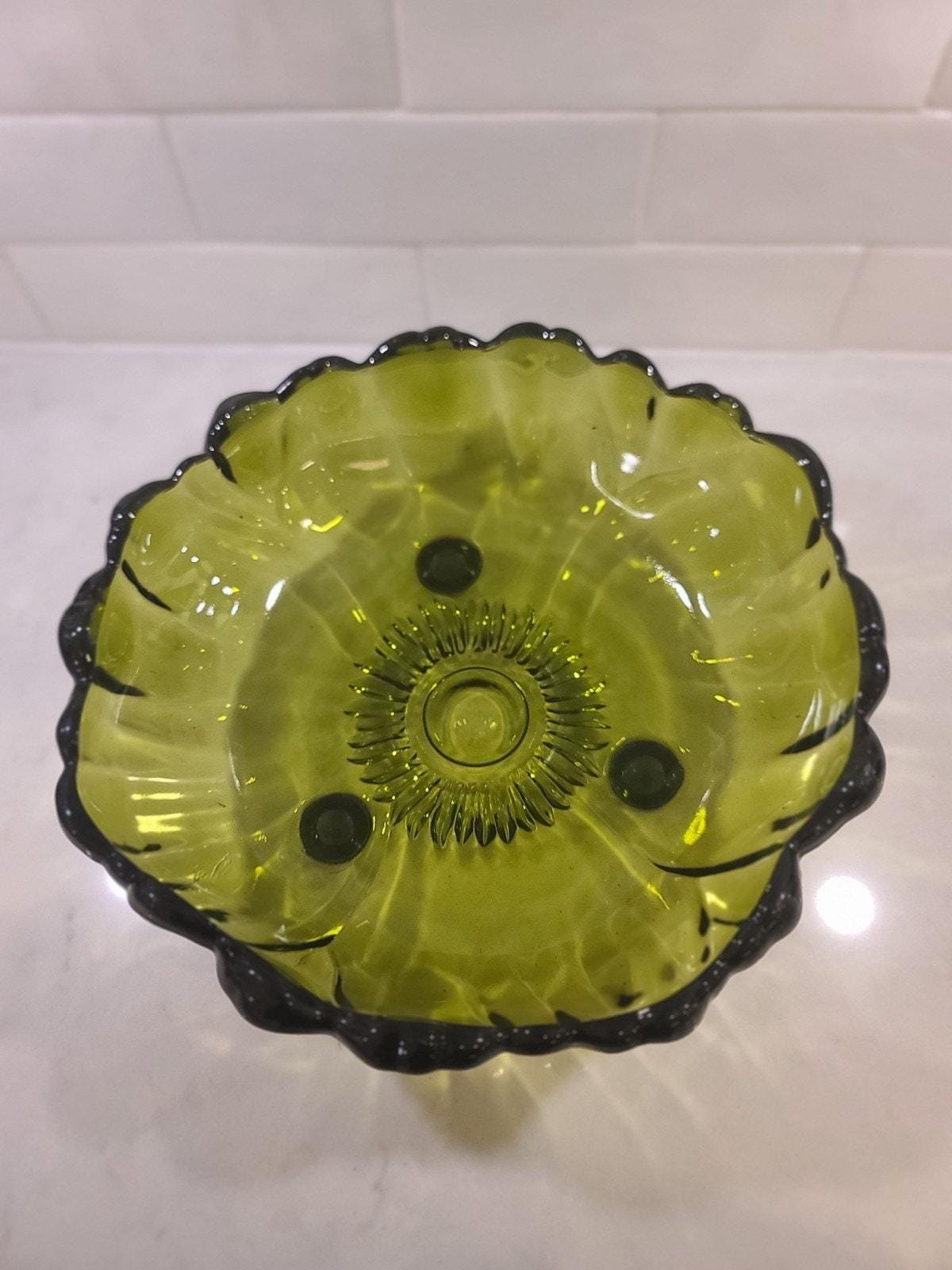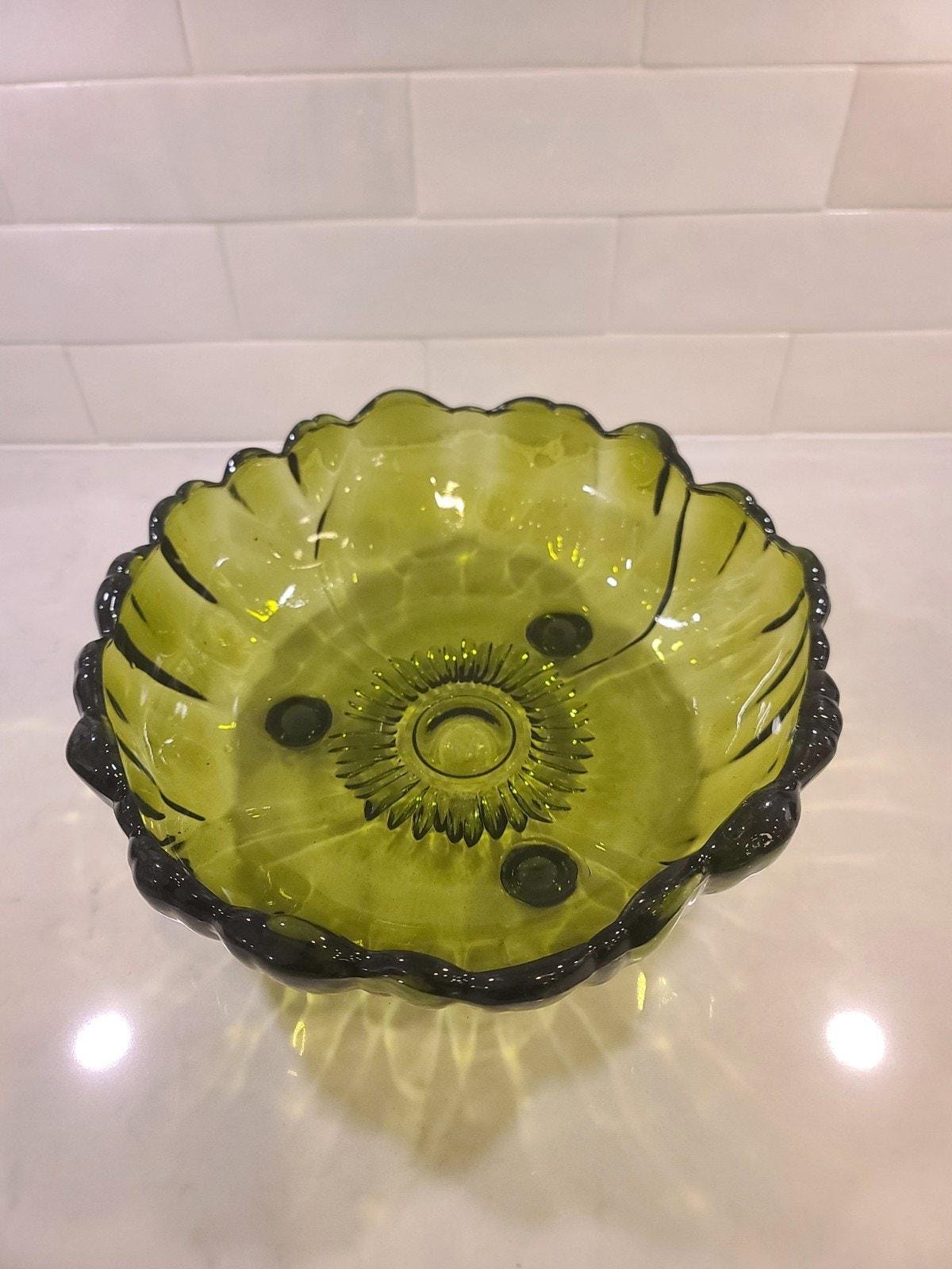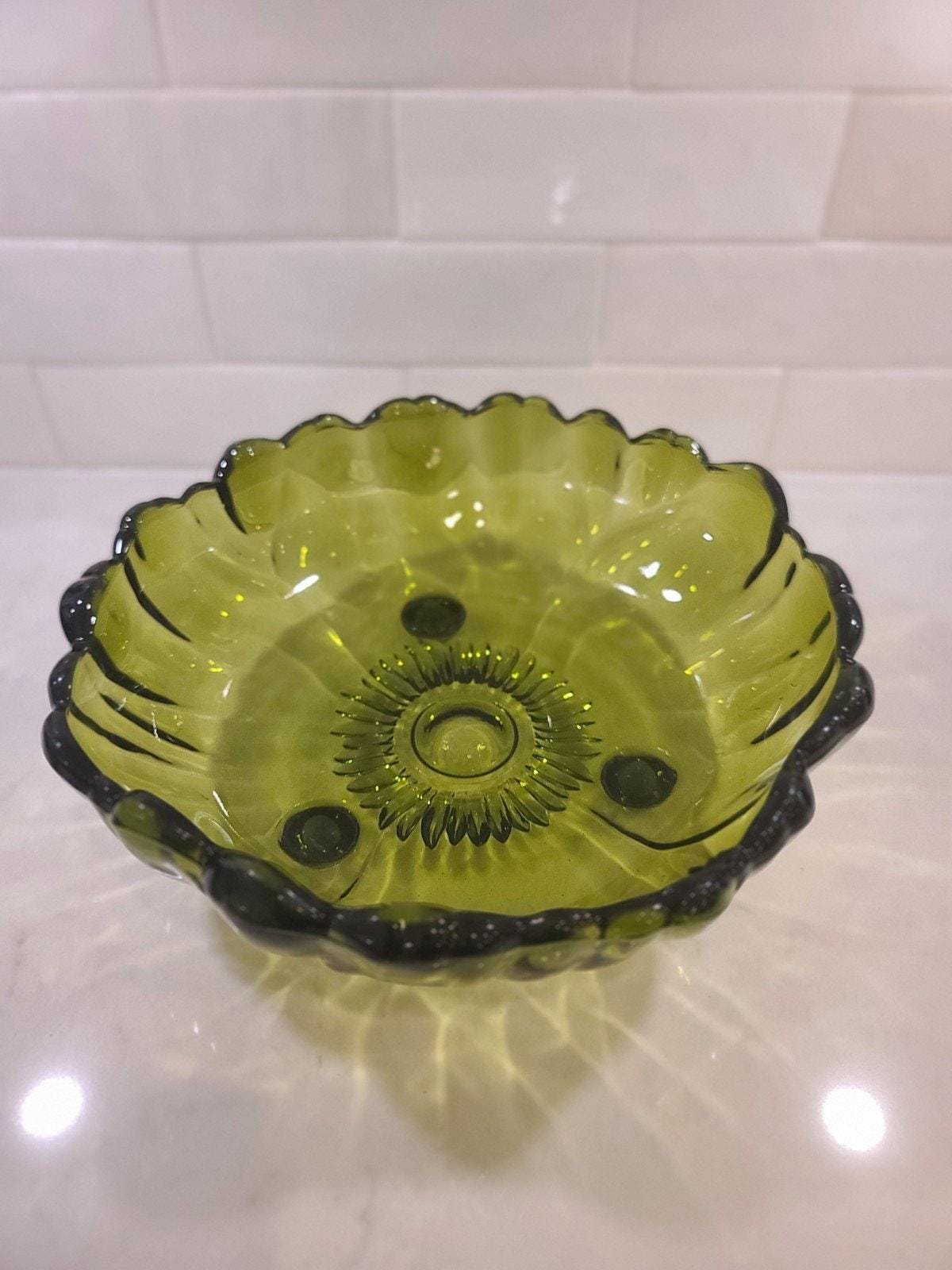 This is the large, hard-to-find 11-inch footed centerpiece bowl by Indiana Glass in their iconic “Sunflower” pattern (also known by collectors as Lily Pons). Produced in the 1970s, this heavy pressed glass bowl features a vibrant Avocado Green hue that perfectly captures the retro MCM aesthetic.