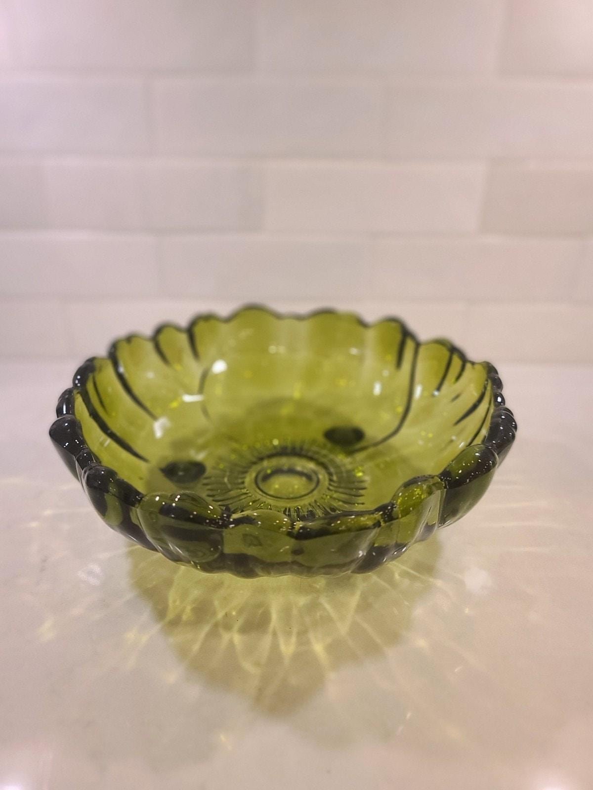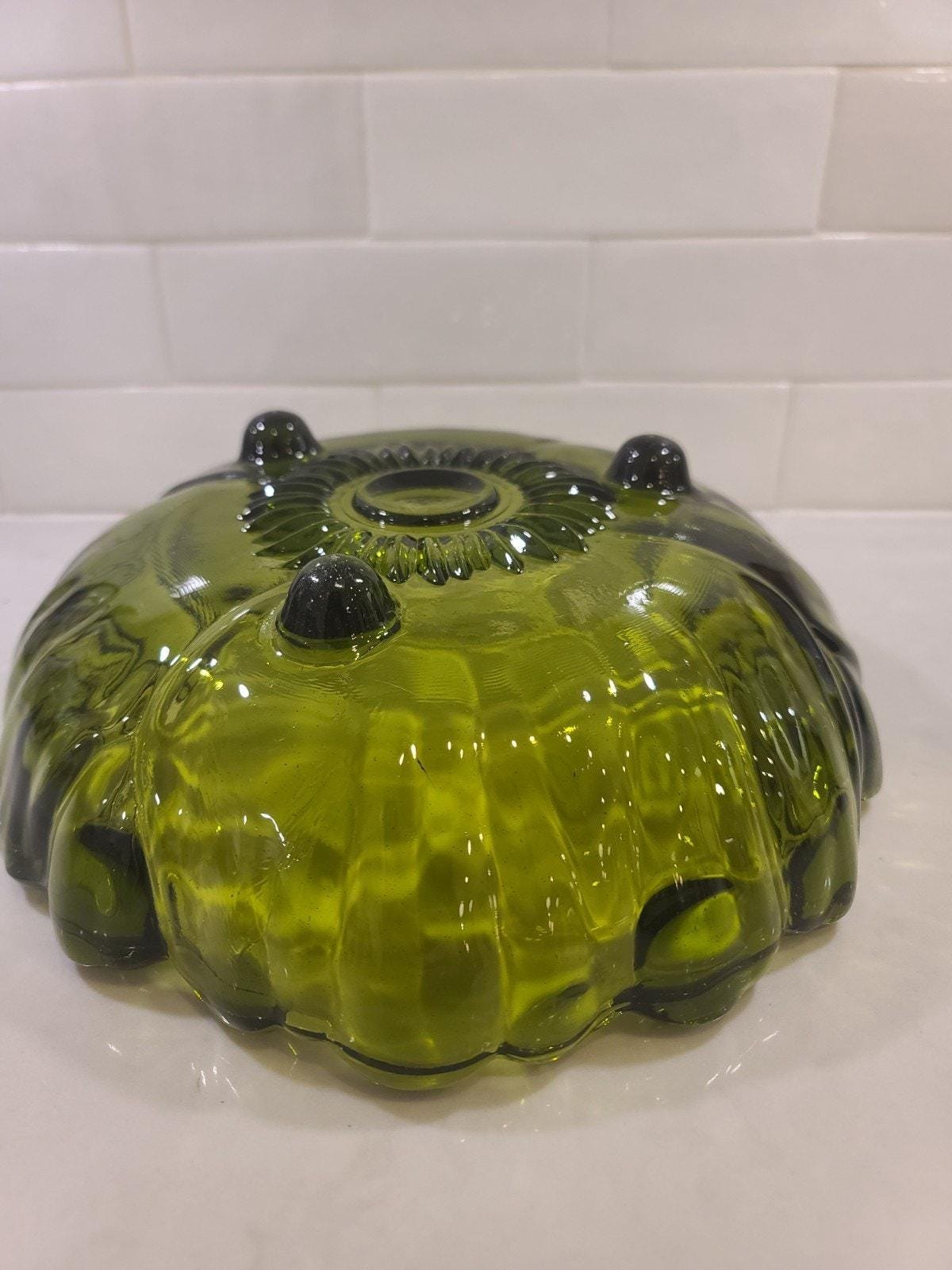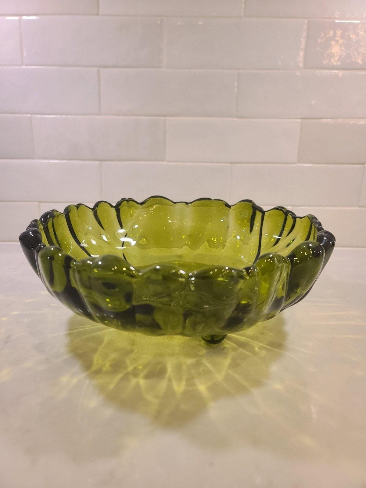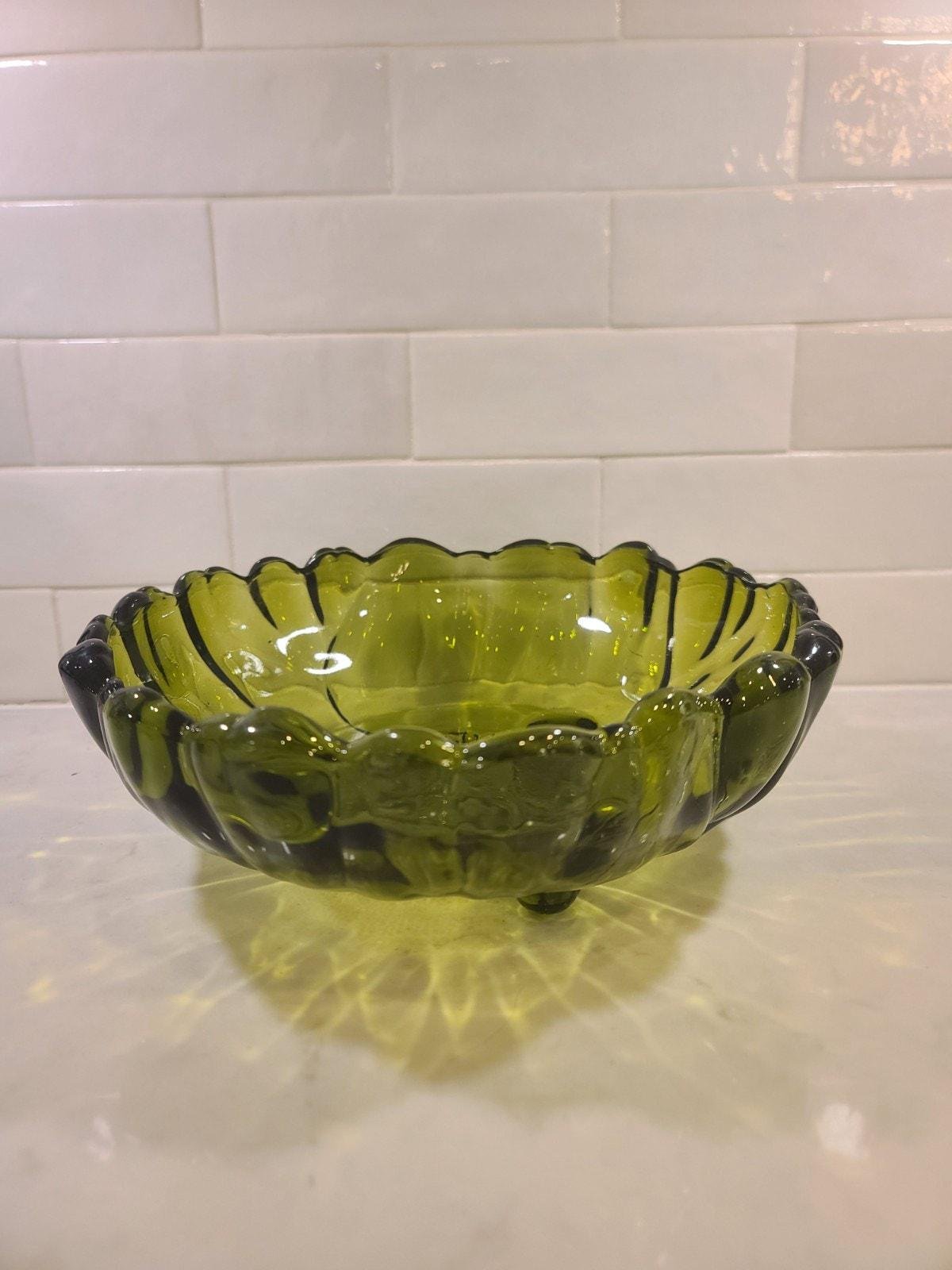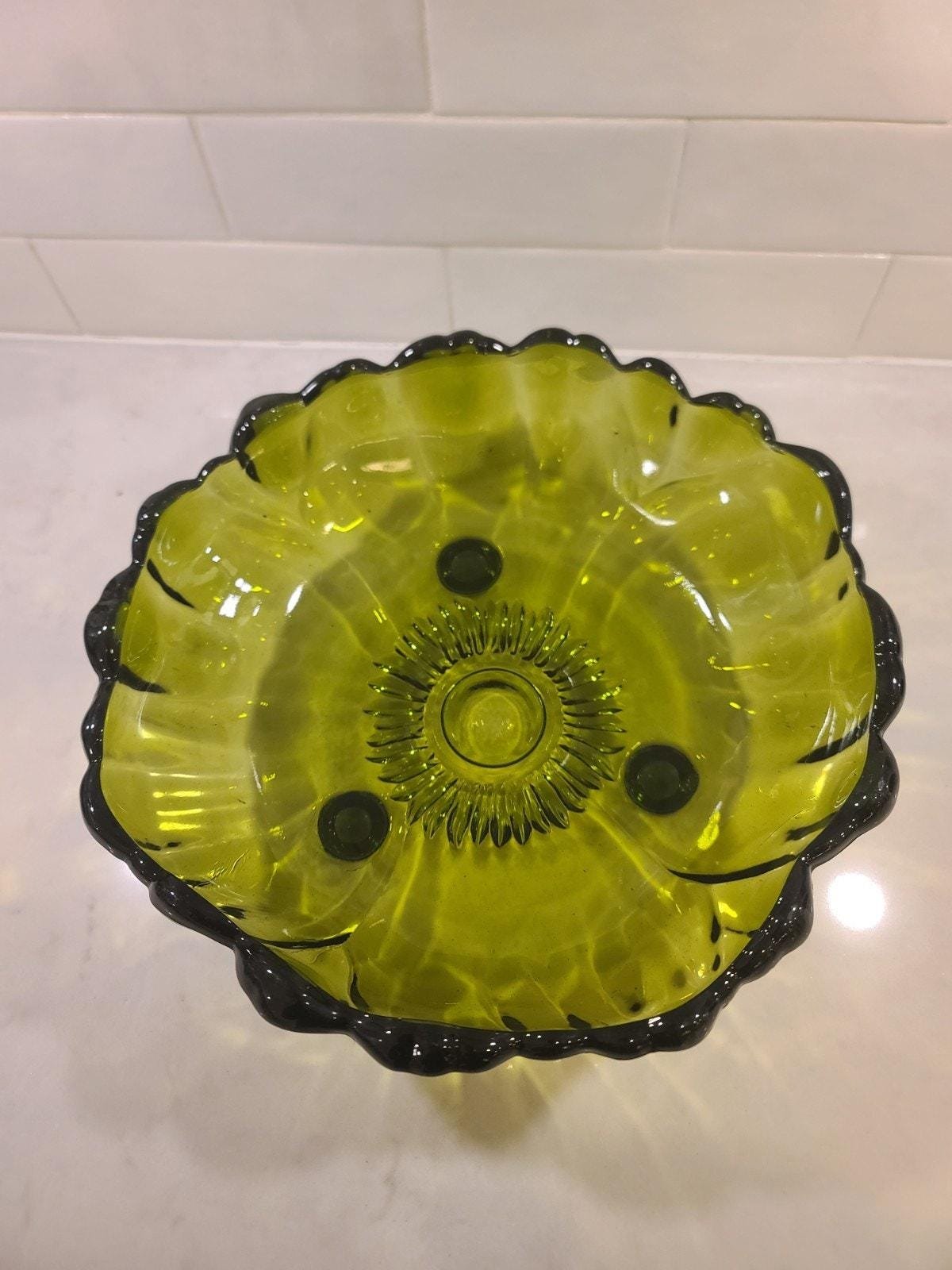 This is the large, hard-to-find 11-inch footed centerpiece bowl by Indiana Glass in their iconic “Sunflower” pattern (also known by collectors as Lily Pons). Produced in the 1970s, this heavy pressed glass bowl features a vibrant Avocado Green hue that perfectly captures the retro MCM aesthetic.